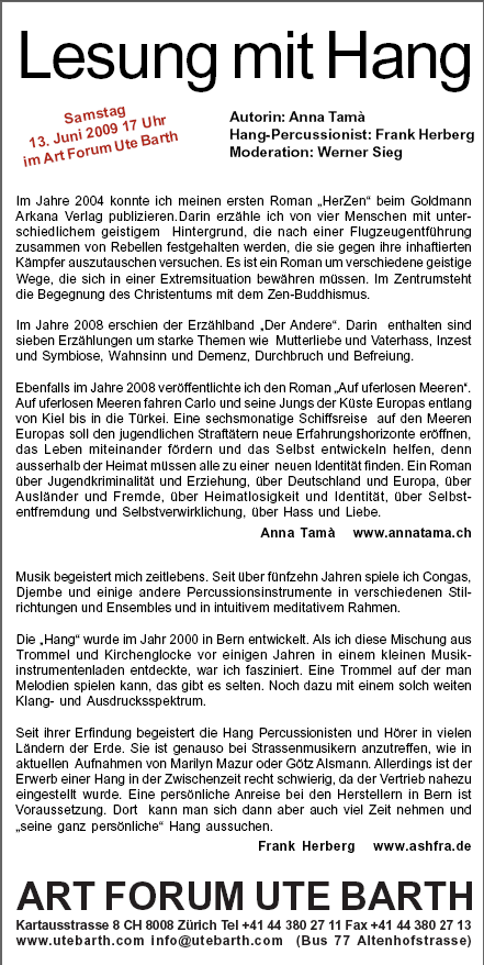 Bücher von Anna Tama - Lesung 13.6.09 17 Uhr Art Forum Ute Barth, Zürich