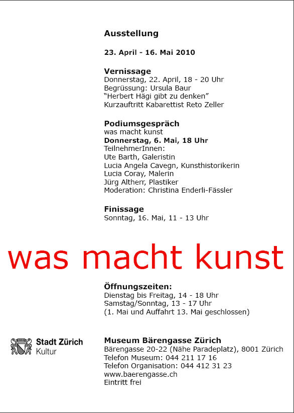 Medienmitteilung WAS MACH KUNST Museum Bärengasse Stadt Zürich Kultur 30. März 2010  Medientext - Ausstellung Museum Bärengasse Zürich April-Mai 2010