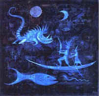 Strupler verwendet fuer seine Bilder meist "Mischtechnik". Er malt zunaechst einen Grund, in dem Chaos und Nichts enthalten sind, darueber legt er Schichten von Farben, schabt, ritzt, uebermalt und zeichnet - und so entstehen diese wunderbaren, phantasievollen Landschaften und Staedte mit ihren Fabelwesen, Vegetationen, Gestirnen und Figuren.