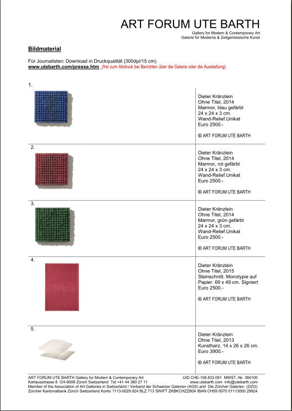 In dieser ersten SOLO SHOW im Jahr 2015 sind Kunstwerke aus Marmor, Muschelkalkstein, Acrylharz und Steindrucke/Monotypien auf Papier vom bekannten Stuttgarter Bildhauer Dieter Kränzlein zu sehen – dies Mal neu auch in strahlendem Rot, Grün und Blau.