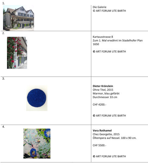 ART FORUM UTE BARTH Tram 2,4 Bus 33 bis Fröhlichstrasse oder Bus 77 (ab Hegibachplatz) bis Altenhofstrasse